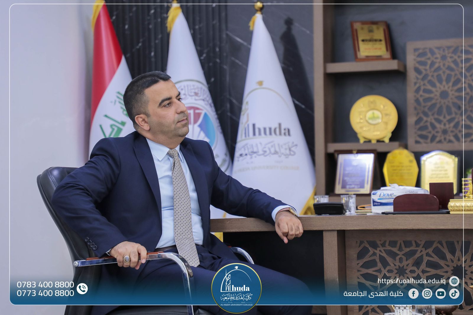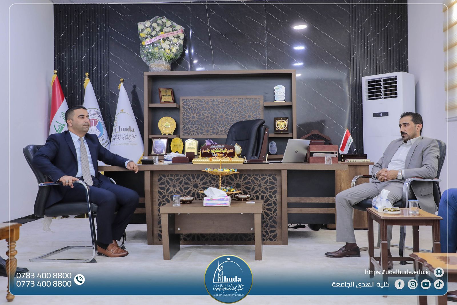 The Dean of Al-Huda University College, Professor Omar Abdul Kareem Jassim, welcomed both Mr.Kwan Ayada Sayer and Mr.Mahmood Amin Sweid from the Financial Control Institution, and they offered their congratulations on his appointment as Dean of the College.