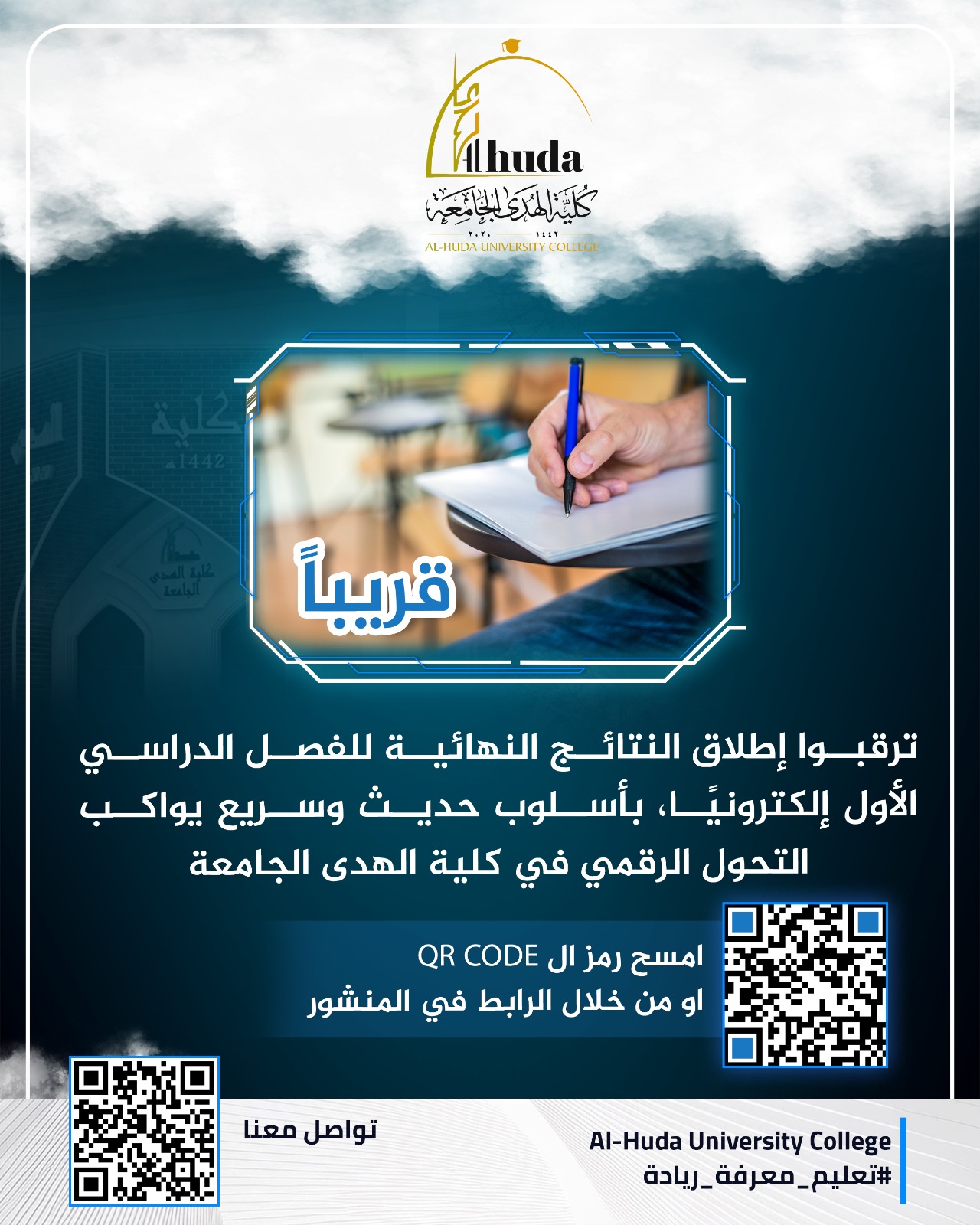Please be advised that the final results of the First Semester will be released electronically in the near future, through a modern and efficient system that aligns with the digital transformation adopted by Al-Huda University College, via the official link below: